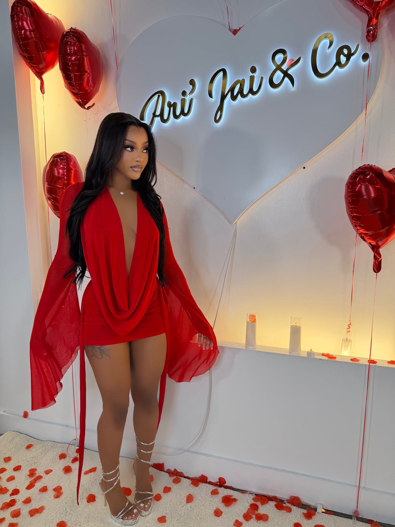 Radiate confidence in the Aurèa Mini Dress. Designed with a sultry draped neckline, sheer bell sleeves, and a curve-hugging mini silhouette, this statement piece moves effortlessly with you while delivering undeniable main-character energy.